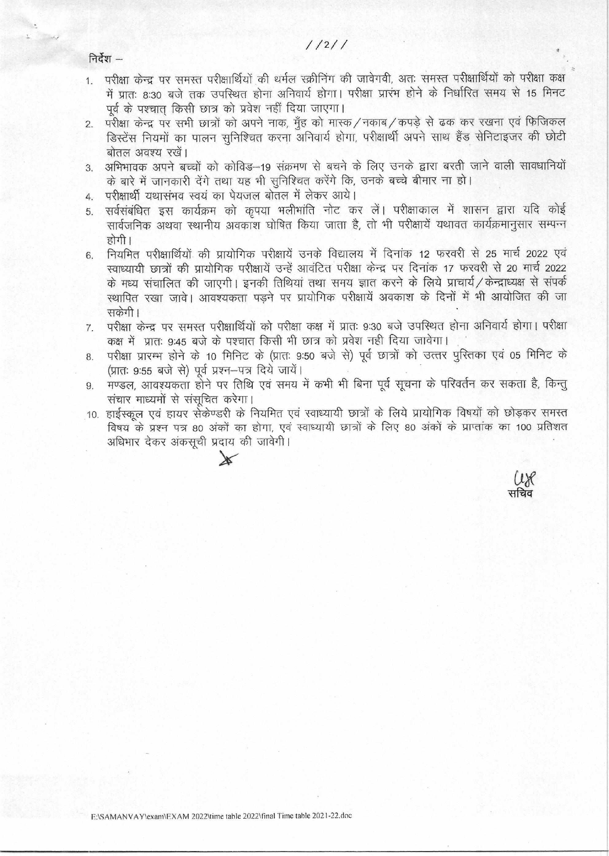 भोपाल। Madhya Pradesh Board of Secondary Education ने कक्षा 10वीं हाई स्कूल एवं कक्षा 12वीं हाई सेकेंडरी स्कूल वार्षिक परीक्षा के लिए टाइम टेबल घोषित कर दिया है। यह टाइम टेबल मध्य प्रदेश के सभी सरकारी एवं प्राइवेट हायर सेकेंडरी, हायर सेकेंडरी वेबसाइट पाठ्यक्रम, हाई स्कूल, शारीरिक शिक्षा प्रशिक्षण, विद्यालय पूर्व शिक्षा में डिप्लोमा (DPSE) प्रशिक्षण संस्थान के लिए है। वार्षिक परीक्षा वर्ष 2022 में आयोजित की जायेगी।