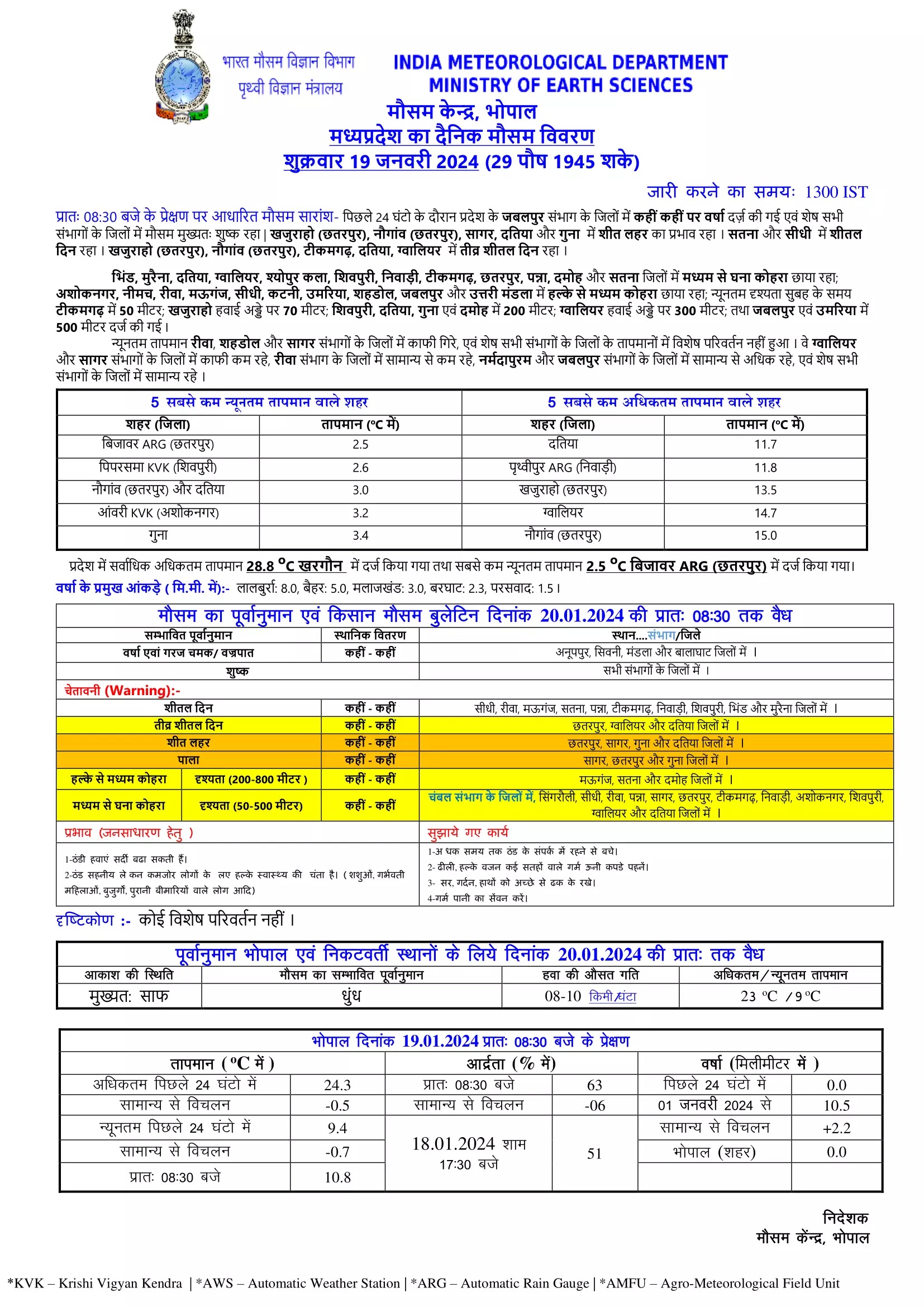 पृथ्वी विज्ञान मंत्रालय भारत सरकार के अंतर्गत मौसम केंद्र भोपाल की ओर से जारी मौसम का पूर्वानुमान एवं किसान मौसम बुलेटिन के अनुसार सागर, छतरपुर और गुना जिलों में पाला पड़ने की संभावना है। इसके अलावा छतरपुर, ग्वालियर और दतिया में सीवियर कोल्ड वेव चलेगी। इसके कारण हवा के सीधे संपर्क में आने वाले लोगों को कई प्रकार की बीमारियों का खतरा है। सागर,गुना के अलावा छतरपुर और दतिया के कुछ इलाकों में कोल्ड वेव चलेगी।